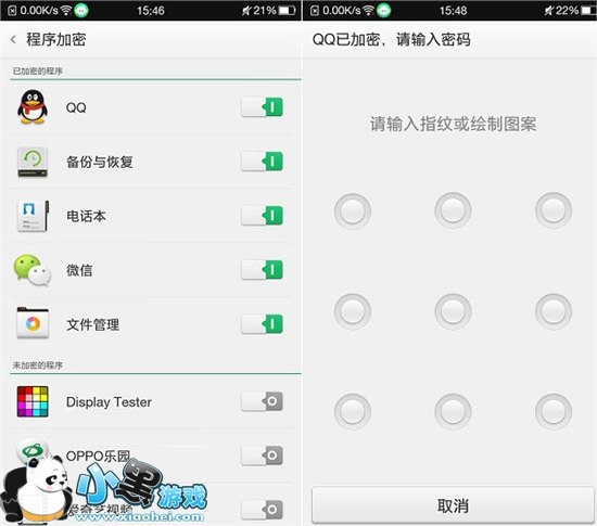 四、如果打开指纹【程序加密】功能,我们还可以设置对哪些应用程序开启指纹加密,开启后,今后打开加密的应用,您就需要使用密码或者使用指纹来打开进行,对于您的隐私会有很好的保护。