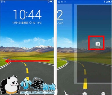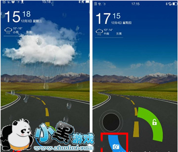 2.解锁界面打开相机(设置锁屏为“天气解锁”,向左下角滑动解锁界面)