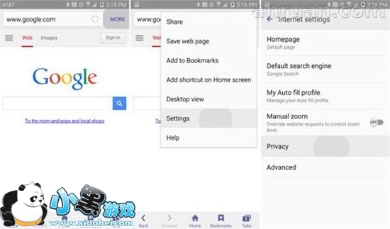 点击 Galaxy S6 上的 Web 浏览器“互联网”,点击屏幕右上角的菜单按钮。菜单的弹出后,在那里你可以向下滚动并选择“设置”,然后简单的浏览后选择“隐私”。