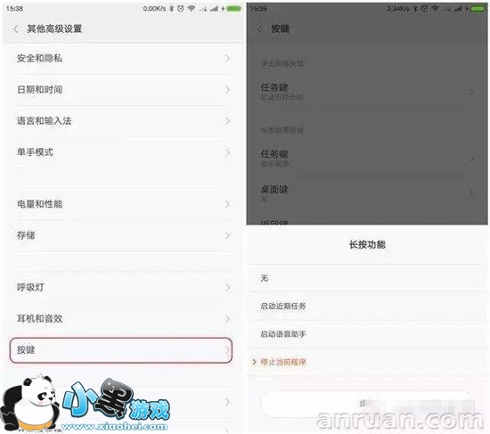 程序运行完毕后,按返回或Home键并不是关闭程序,只是将其切换到后台,程序其实还在运行,占用CPU又占用内存,不关闭,既耗电又拖慢手机速度。MIUI有两种解决办法,第一,在设置-其他高级设置-按键中,把长按返回键设置成停止当前程序;
