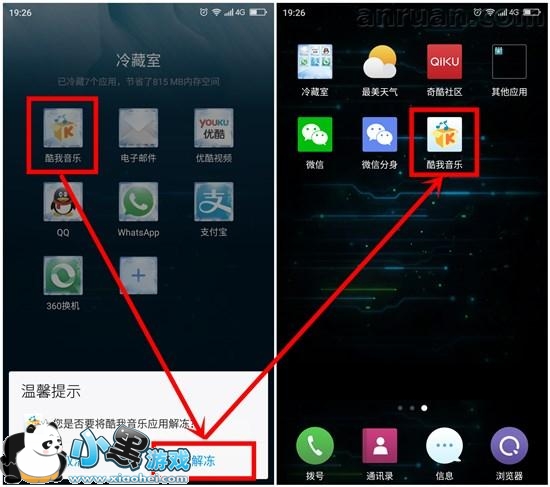 想要解除冷藏是我们只需要单击应用选择解冻即可,期间有个动画效果,挺有意思,我们发现应用又回到桌面了。