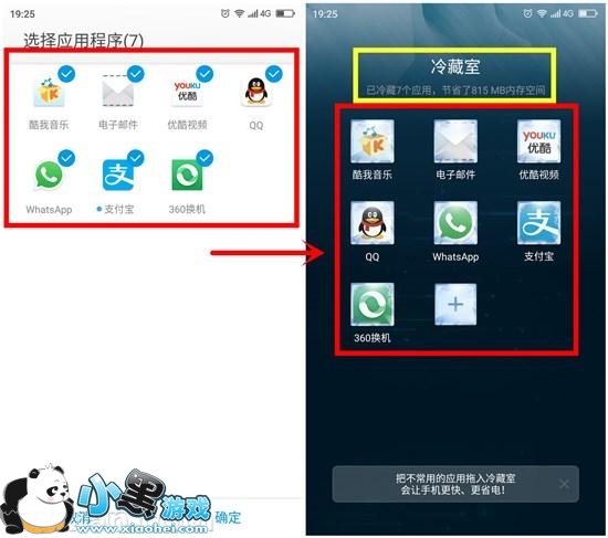 点击加号之后我们就发现有很多可以加入冷藏室的应用,这时候我们发现可以多选,然后批量加入,这就是在桌面不能实现的了,加入后我们发现有一个提示“已冷藏7个应用,节省了815MB内存空间”,一目了然,很清晰~