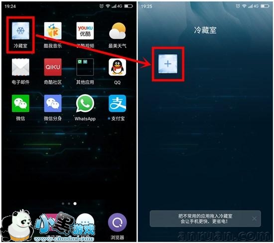 首先,我们打开冷藏室,看到有个加号,我们点击这个加号,其实我发现在桌面直接拖动图标也可以把应用拖进冷藏室,但是这个方法看起来更文明而且有更多的作用;