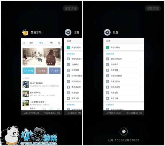 然后我们来看下加入冷藏室前后的对比,左边是加入前,右边是加入后,这了后台我没有进行过任何清理,我们发现加入冷藏室后后台运行不见了,并且清除了内存,说明加入冷藏室的应用被冻结了。