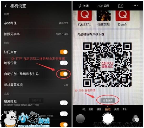 进入设置后,打开 自动识别二维码和条形码 开关即可,举个例子扫码奇酷社区客户端二维码,将相机对准二维码后,会自动识别二维码并且屏幕上提示 查看详情。