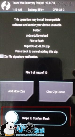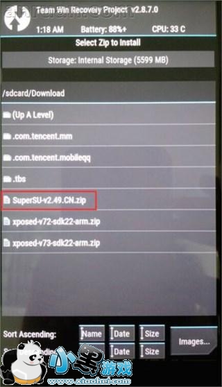 Recovery刷好之后呢。我们还需要root包才能完美Root!这里提供的是SUperSU PRO最新专业修改版,全面支持安卓全版本包括最新的5.1.1。下载SuperSU-v2.49.CN.zip,不要解压,把他放出手机内存根目录下,然后进入TWRP Recovey(手机进入BL界面,按音量键选择到Recovery Mode,再按电源键进入)后刷入即可。