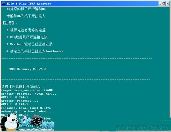 因为官方的recovery功能太少且不完善,只能做做wipe和升级ota之用,基本不能做其他事了。第三方recovery的强大,大伙都知道了,所以,很多时候我们需要第三方recovery来解决。这不刚刚XDA大神就出了MOTO X PLAY 的TWRP Recovey了,我们可以愉快的刷机啦。