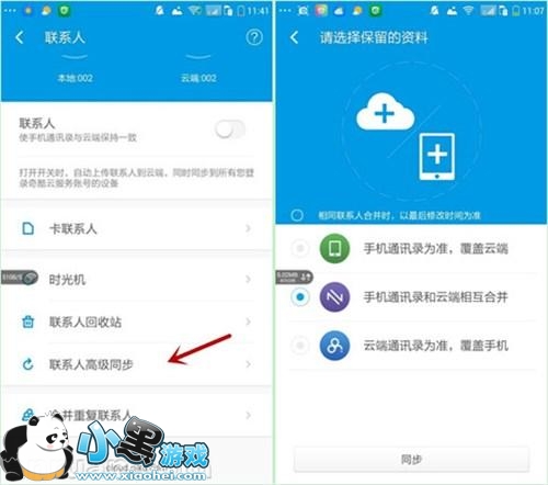 在卡联系人中,只要打开上传开关,手机端的联系人列表会自动上传至云端保存。但如果云端联系人列表和手机端联系人列表不同,或者您需要以云端/手机通讯录列表为准时,您就需要“联系人高级同步”来帮助完成。点击进入“联系人高级同步”,根据需要选择:手机通讯录为准覆盖云端/手机通讯录和云端合并/云端通讯录为准覆盖手机。