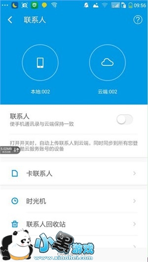 联系人数据的保存和移动是一个庞大的工程,也是我们用云做的最多的事,那就先来看看联系人的云服务功能吧。点击云服务首页的“联系人”后,可以看到手机端(本地)联系人数量和云端联系人数量。打开联系人手机通讯录与云端保持一致的滑钮,将在您每次登陆云服务时自动上传联系人到云端,同时同步到所有您登陆的奇酷云服务账号的设备里。