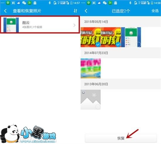 在云相册中点击“查看和恢复照片”,可以看到您成功上传到云端的所有照片和视频。如果您查看的同时想要恢复部分照片和视频,您可以点击右上角“选择”,选中您需要恢复的那一部分照片视频,点击“恢复”即可。