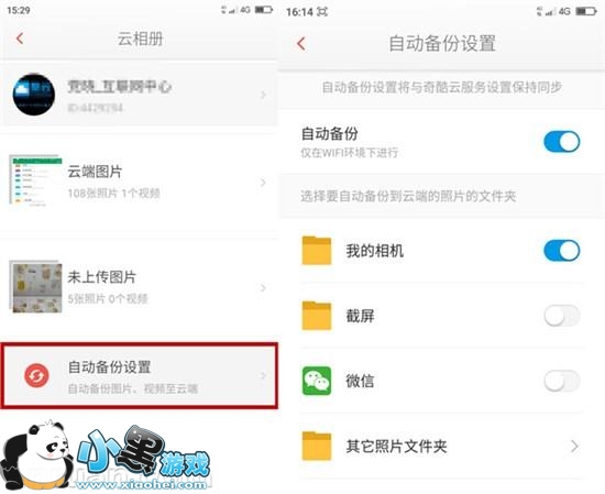 您可以点击云相册的自动备份设置,对备份图片、视频等进行设置。我们默认仅在WIFI环境下为您进行云相册备份,您可以根据需求自行设置。您也可以手动添加要自动备份到云端的照片的文件夹。