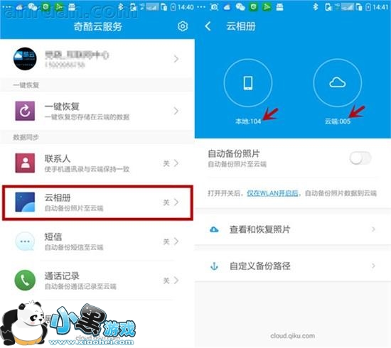 如果您使用的是非360 OS 系统,那么进入云相册,您就会看到如下的云相册版本啦!您会看到本地及云端的照片数量;也可通过该界面查看和恢复照片。也可以手动设置,自定义备份路径;