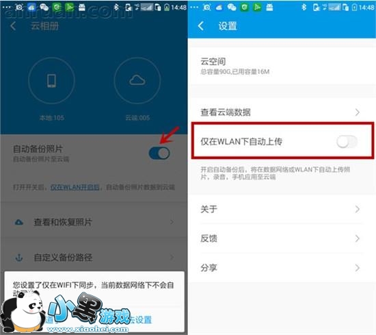 进入云相册后,打开自动备份照片的开关,您会看到提示“您设置了仅在WIFI下同步,当前数据网络下不会同步”。我们为了保护您的个人数据流量,默认设置仅在WIFI下为您上传照片、录音、手机应用等数据。您也可以点击“去设置”进行更改。