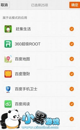 最后,在这里可以打开隐隐模式,同时可以设置在低电量时自动开启该模式的选项,我们也可以指定程序在该模式下不使用网络与GPS功能,点击应用配置菜单项,在打开的页面中选择指定的程序就可以了。