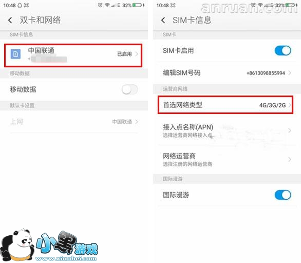 二、进入双卡和网络设置后,再点击进入“目前所使用的网络”设置,时候点击一下首选网络类型,如下图所示: