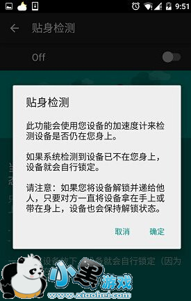 需要说明的是,贴身检测功能在Android 5.0中默认关闭的,因此我们需要手动开启。设置——安全——Smart Lock——贴身检测,打开贴身检测功能即可。