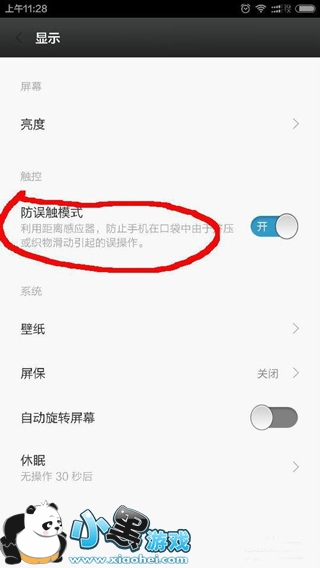 5、在显示里面找到——防误触模式,将这个关闭就不会出现 “请勿触碰橙色区域”的提示了。