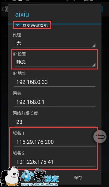 第三步:在点“显示高级选项”后,会出现IP设置,默认为DHCP,点击DHCP,选择静态。然后下面会出很多少选项,只需要把,域名1和域名2(域名1和域名2也就是DNS,很一些手机显示不一样)改为就行了,其他的不需要管。DNS1为115.29.176.200 DNS2为101.226.175.41,然后保存。