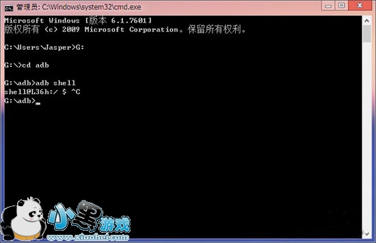 输入adb shell,测试是否可以正常连接手机。若显示 shell@XX:/ $(XX为你的机型名),则连接正常,按「Ctrl键+C」退出测试。