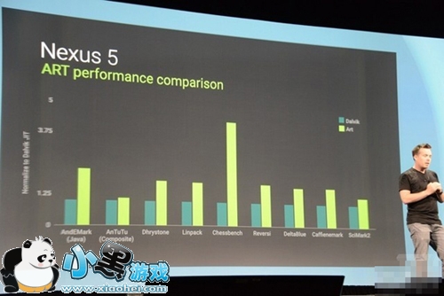 除了在具体应用上的表现外,ART 模式的引入也实现了 Android 性能的提升。根据 Google i/o 大会期间一张官方幻灯片显示:ART 模式相比较 Dalvik 模式能够实现 80% 的提升,最多的时候能够达到 1.5 倍。而在实际体验过程中,小编也能够感受到这系统性能额提升,更加流畅的过场动画,更加跟手的操作体验,这一切于广大 Android 用户来说不得不说是莫大的好消息。