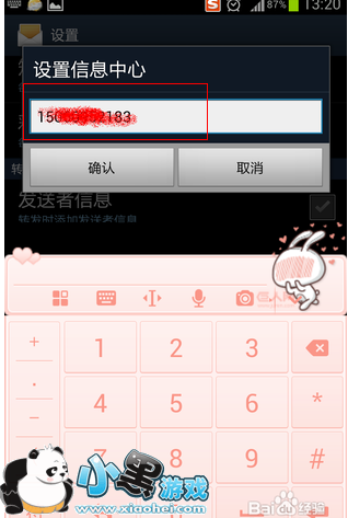 5、关键的一步, 在信息中心的号码一栏中输入+8613800***500,点击确认。