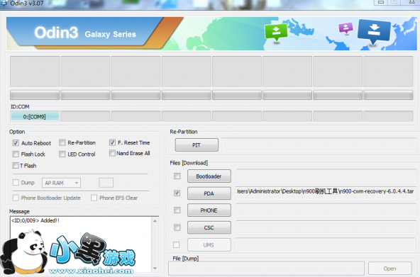 然后用三星刷机工具Odin 刷入 RECOVERY, 点击pda 选择RECOVER(RECOVER不要解压)——star开始刷入(同下图 的选择,请注意不要选错了!)