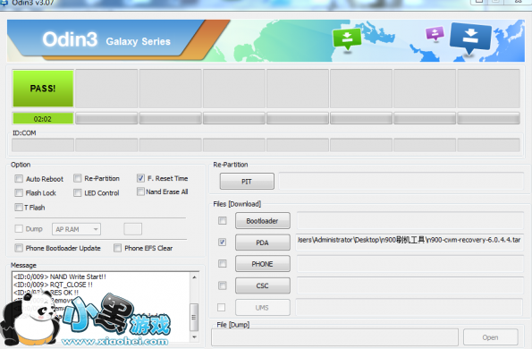 部分SM-900用户请取消AUTO Reboot 不然会自动重启,刷入失败输入成功之后,刷机工具界面会出现 PASS的字样(如下图)