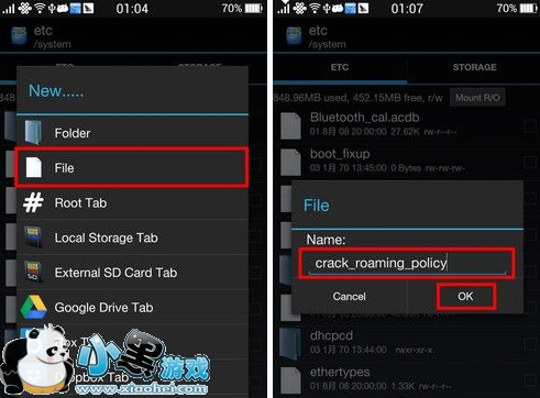 打开RE文件管理器,在/system/etc目录下,新建一个名为crack_roaming_policy的文件,保存。期间如果遇到风险警告,请全部选择通过。