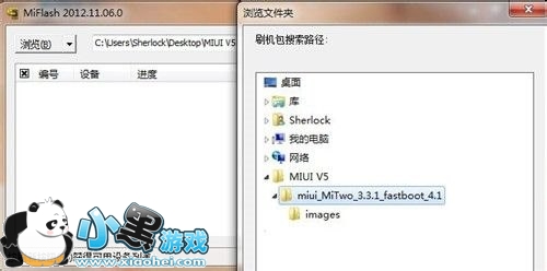 2. 解压下载后的文件,然后运行刷机工具MiFlash,点击左上角“浏览”,直接找到"miui_MiTwo_3.3.1_fastboot_4.1"文件夹后点击确定。之后再单击“刷新”按钮。