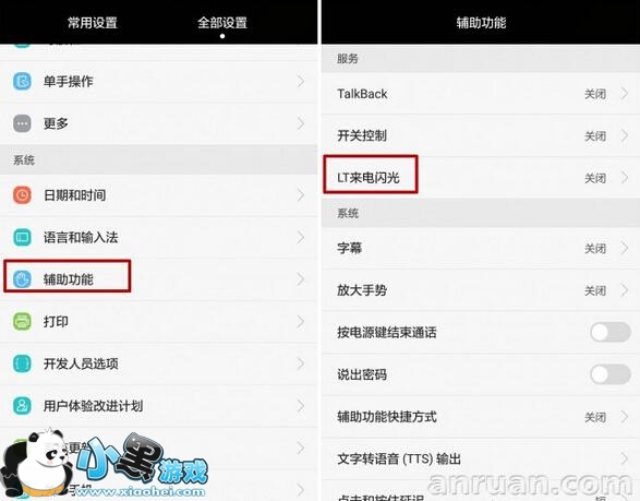 2、下滑以后找到辅助功能,就可以看到【LT来电闪光】