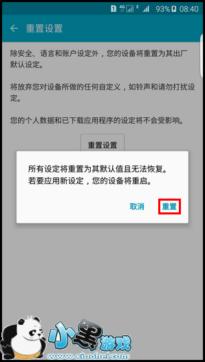 3、选择重置以后,手机即将重启,在保证安全、语言和账户设定以外的设置全部恢复为出厂设置,这样就比纯粹的恢复出厂设置好用很多。