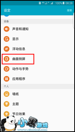 3.向上滑动屏幕,点击【曲面侧屏】,如下图所示: