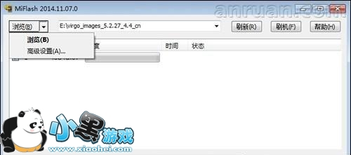 6、点击刷新按钮,下方会显示手机的代号,然后点击浏览,找到你线刷包的位置,确定后点击浏览方便的小三角,进入高级设置。