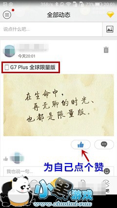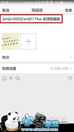 Step6、这里需要输入一串代码(代码会在最后提示显示可复制的),输入代码之后就能自定义你喜欢的型号了。后面输入代码:“[em]e10002[/em]G7 Plus 全球限量版” 点击发表即可。还可以同步到微信。