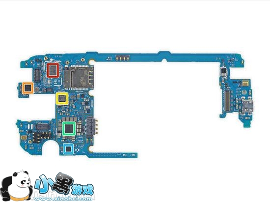 反面:红:Avago ACPM-7717。橙:高通WCD9330音频编码器。黄:SlimPort ANX7816超高清收发器。绿:高通PM8994电源管理单元。蓝:NXP 47883 NFC控制器。