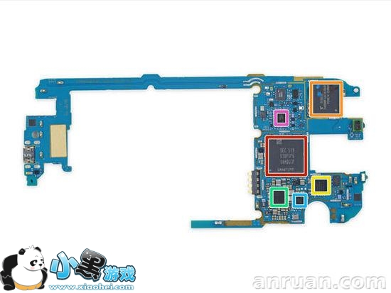 拿下主板,很容易,但是别激动的掰断了:红框是三星K3QF6F60AM-QGCF LPDDR3 3GB内存、高通骁龙808六核处理器。橙框是东芝THGBMFG8C4LBAIR 32GB NAND闪存。黄框是博通BCM4339HKUBG 5G Wi-Fi无线模块。绿框是高通PMI8994电源管理单元。蓝框是DIT P9025A Qi无线充电接收器。靛框是高通WTR3925 LTE接收器。