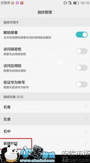 3、然后,就可以通过【新建指纹】,来添加手机的指纹录入,另外指纹录入的时候,还是和以前一样最多支持录入5组手指的指纹,不过速度更快,精确度更高。