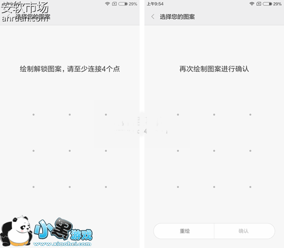 3、使用过小米手机的童鞋都知道,它的锁屏方式是上下滑动的。想要保护隐私的童鞋可以选择“图案”密码的设置方式,手动输入你想要的图案即可,如图所示: