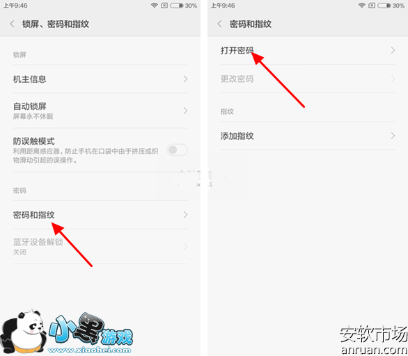 2、然后选择【密码和指纹】---【打开密码】点击进入,之后会出现“图案”、数字”、“混合密码”三种设置方式,如图: