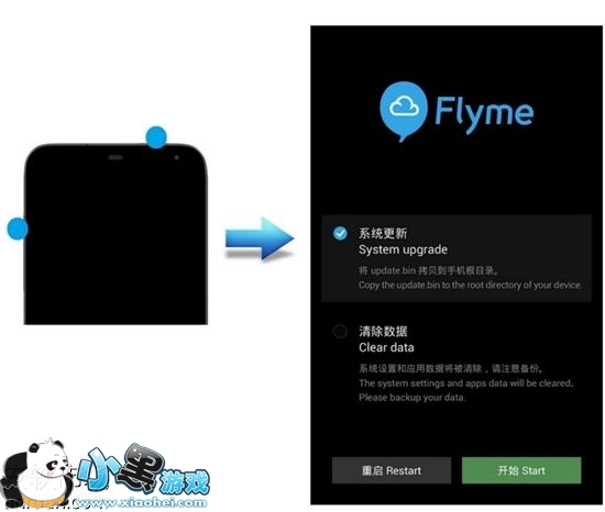 1、在手机关机或者重启状态下,先长按音量加键再长按电源键,出现Meizu标志之后同时松开,使手机进入升级界面(recovery模式)。