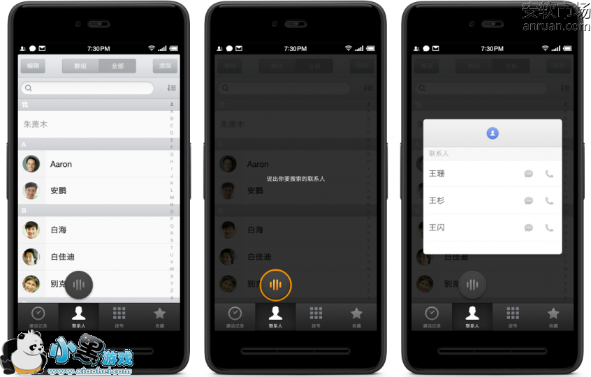 电话联系人列表界面的语音搜索入口,可在“设置”-“搜索和语音”中隐藏;