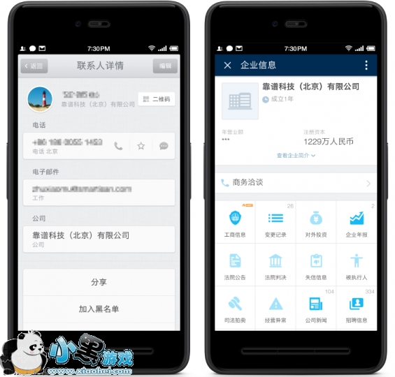 联系人详情中的“公司项”,点击可查询该公司的工商信息;