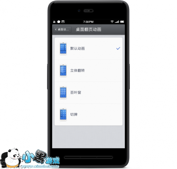 立体翻转、百叶窗、切牌等 3 种多宫格桌面翻页动画,可在“设置”-“桌面设置项”-“桌面翻页动画”界面选择不同的桌面翻页动画效果;