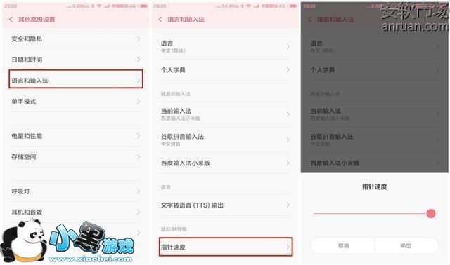 还有一个简单提升操作流畅度的小方法,进入到“设置”界面,选择“其他高级设置”选项,进入之后再选择“语言和输入法”选项,在最下方你会发现有个“指针速度”选项,系统默速度在中间位置,我们可以将它调到最快,以上两步全部设置完毕之后,再去试试是否感到了一丝畅快。