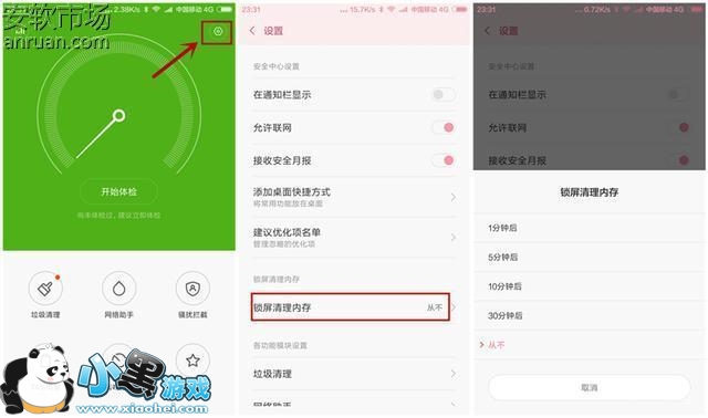 新版的MIUI 7系统中还有一个“锁屏清理内存”选项,设置之后,系统会在锁屏之后自动进行内存清理,解锁就可以直接体验畅快感了。通过“安全中心”右上角的图标进入到 “设置”界面,进入之后可以进行相应的时间设置,锁屏到了指定的时间之后,系统就会自动进行内存释放。对于一些比较常用的应用,我们还可以在“建议优化项名单”中间进行设置。