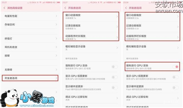 然后进入“设置”界面中的“其他高级设置”选项,在下方的位置就会出现一个“开发者选项”。进入“开发者选项”界面,下拉你就会发现有三个动画缩放选项,系统默认的数值是“1x”,你可以将动画缩放全部设置为“0.5x”后,再试下是否操作的速度有所加快呢?如果想要更快,那你可以直接关闭缩放动画,关闭之后速度会更快,不过相应的视觉上就有所欠缺了,所以不建议直接关闭。
