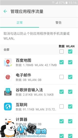 比如我将“电子邮件”和“互联网”的数据取消对勾状态,那么它们将无法在你仅使用移动网络时使用你的流量,同样你也可以禁止WLAN,但通常来讲没人会这样做,除非你的WLAN套餐是限流量的。
