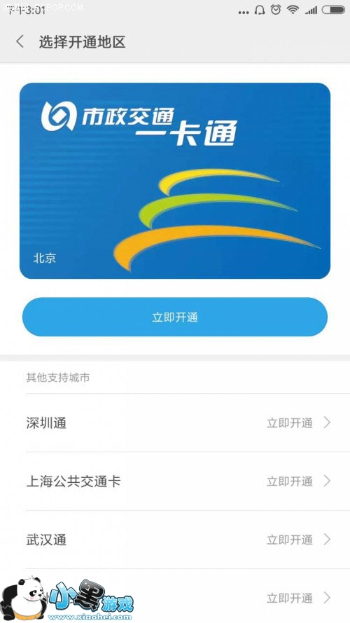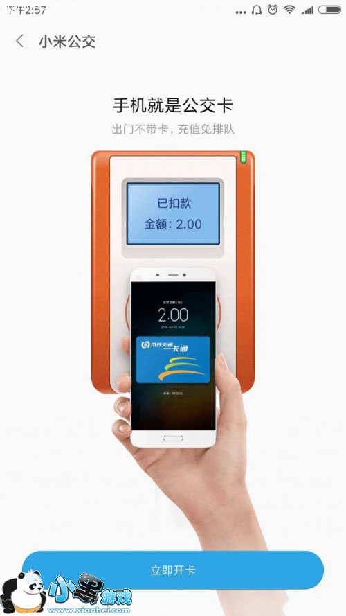 点开后,有个开卡的界面,前提是你的银行卡已经绑定小米钱包,不过绑定也就分分钟的事儿,银行卡往手机后面一贴,自动识别卡号。接下来,点立即开卡就行。