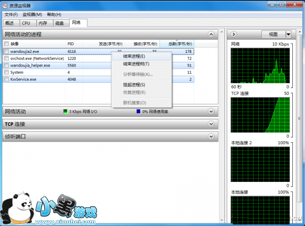 单击“开始→运行”,输入“perfmon.exe”,启动程序后切换到“网络”,这里列出了当前系统中所有连接的网络程序,按住Ctrl键多选不需要连接网络的进程,然后右击选择“结束进程”,批量结束不需要的网络进程即可(图4)。