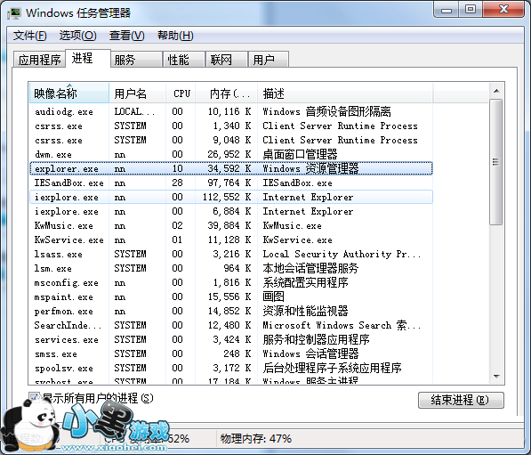 另一方面是可用资源不足,是由于系统当前运行过多的后台程序导致。运行的程序过多会导致系统可用内存不足,从而造成系统运行变慢。解决方法:使用任务管理器,将占用CPU和内存较多的进程终止(图3)。